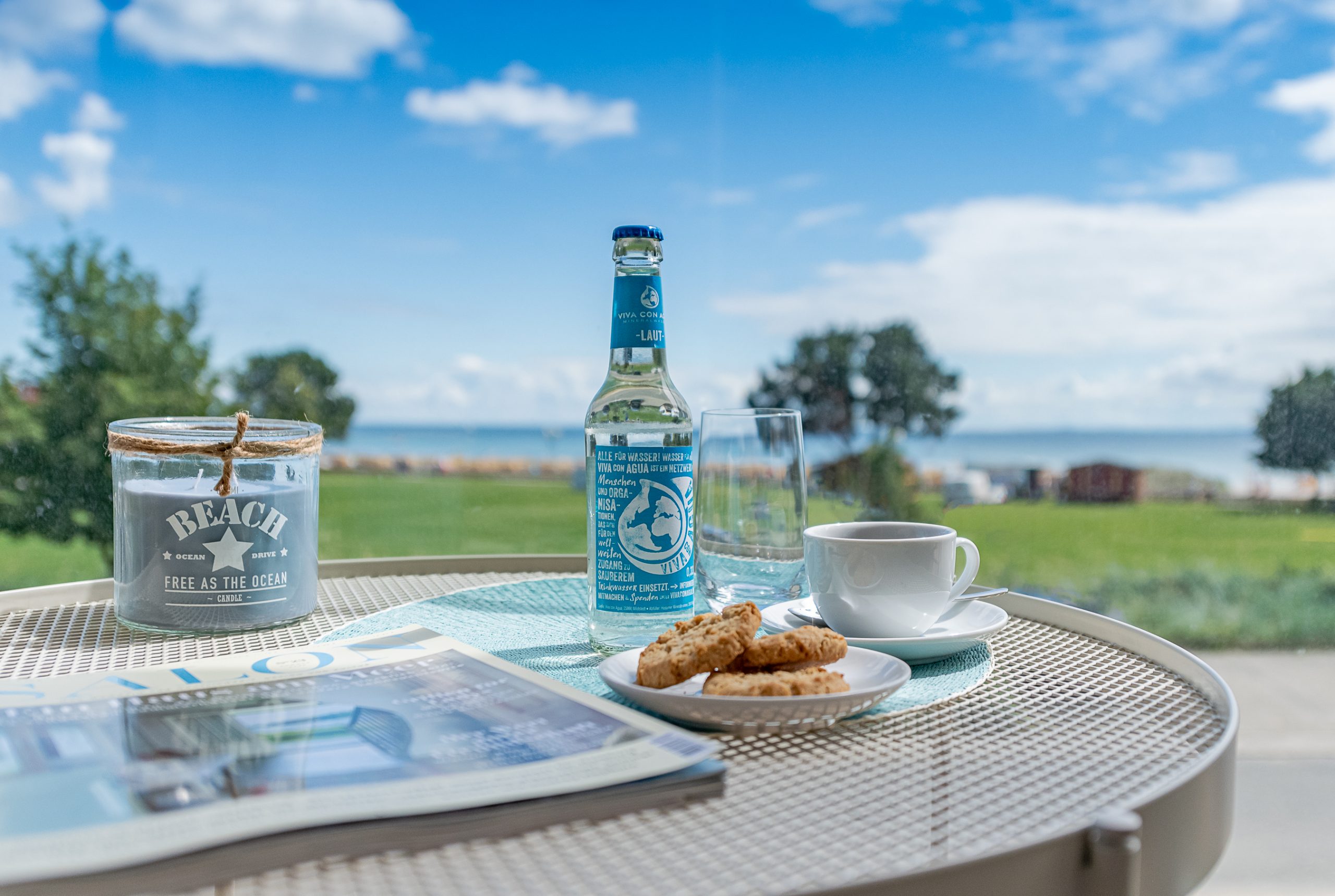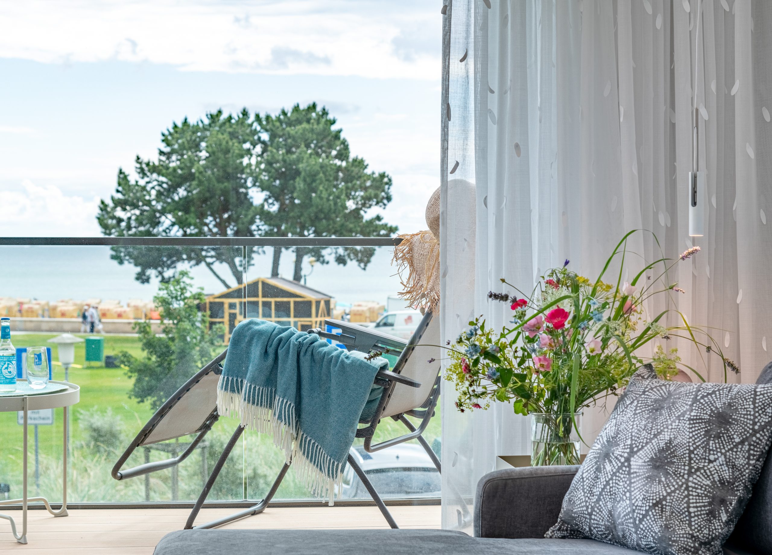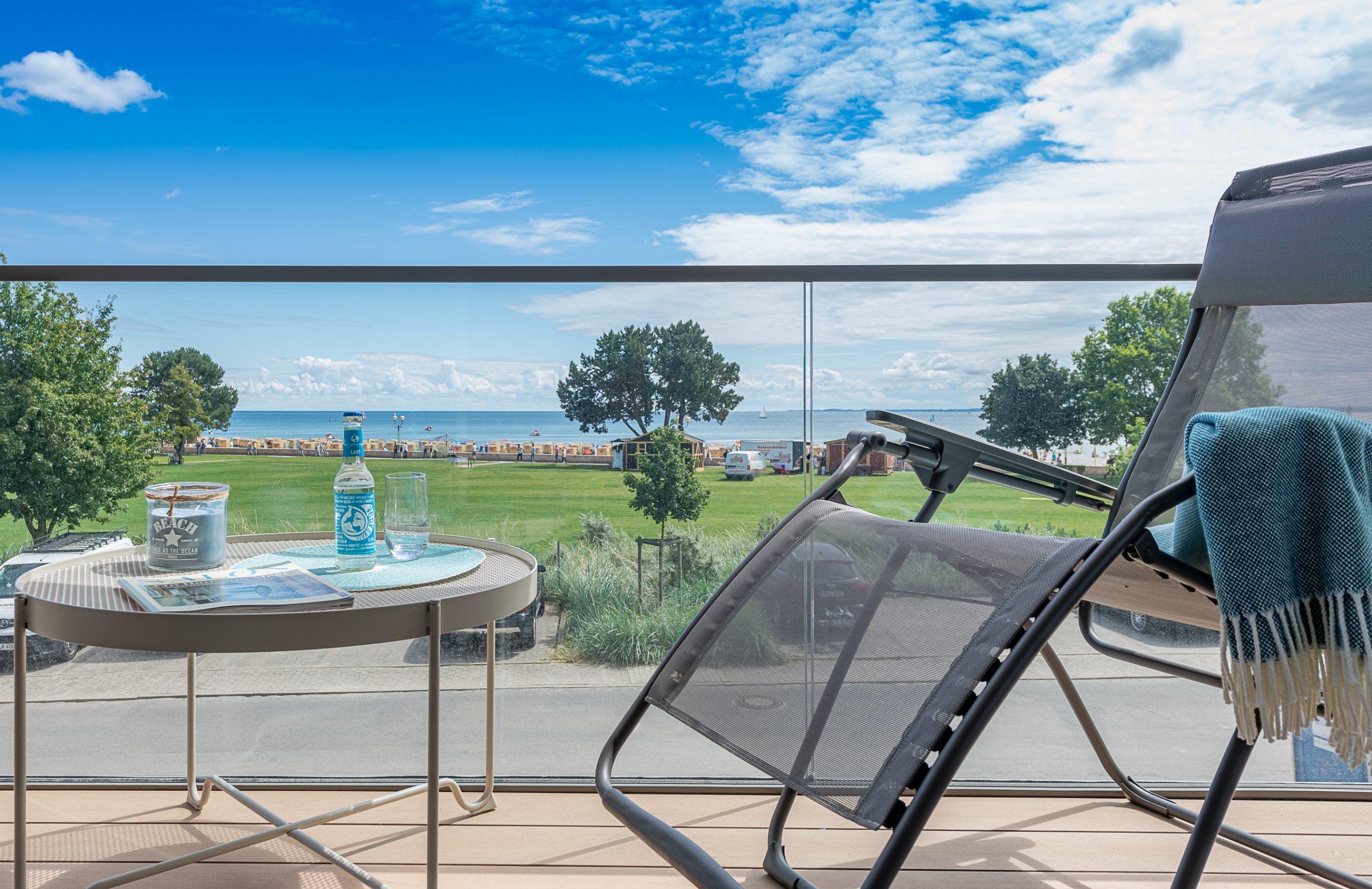 Auf dem charmant angelegten Balkon mit Südausrichtung und direktem Meerblick lässt es sich wunderbar mit einem leckeren Kaffee in den Tag starten. Lassen Sie sich von der unvergleichlichen Panoramaaussicht über die Ostsee verzaubern und schnuppern die frische Seeluft.