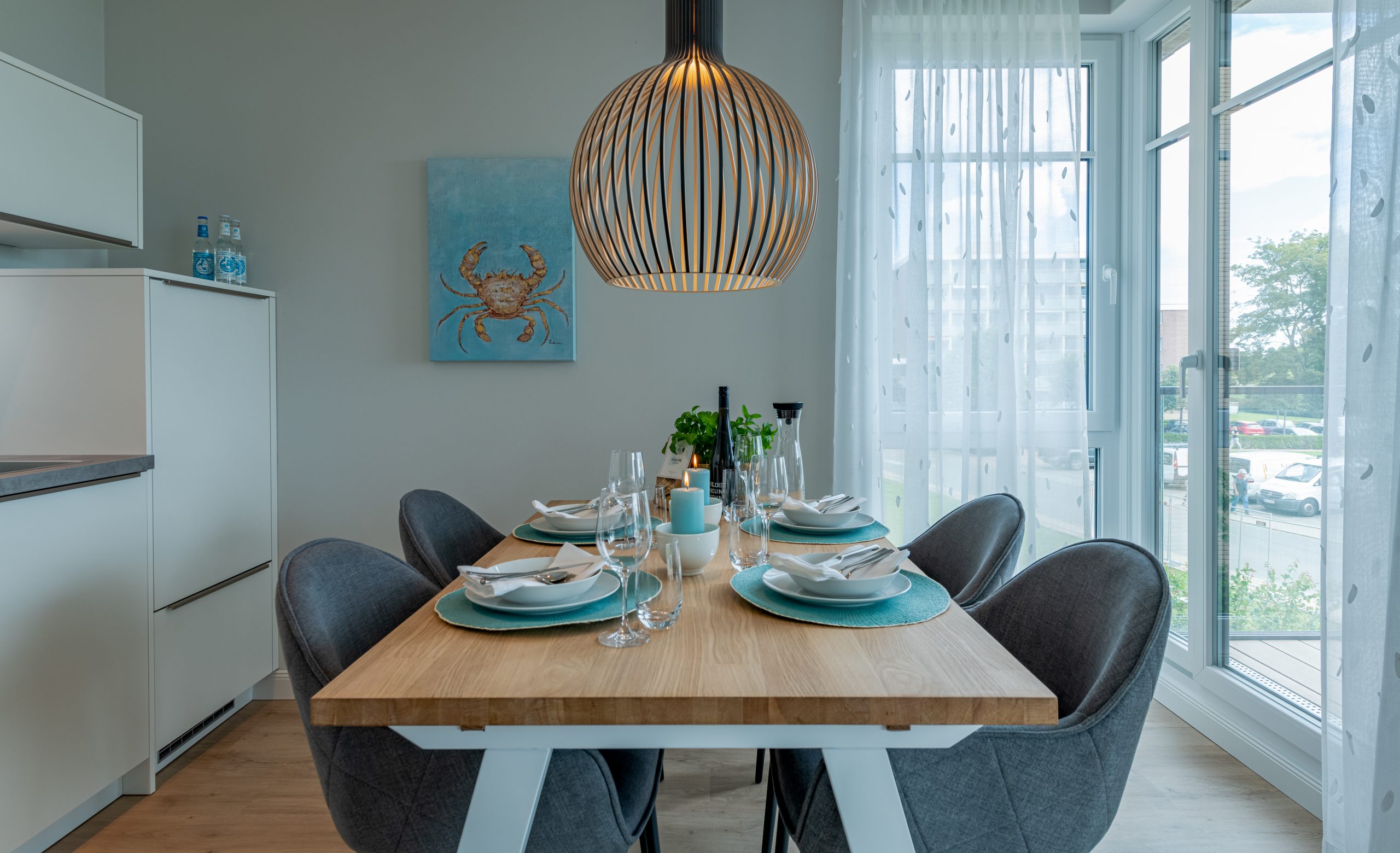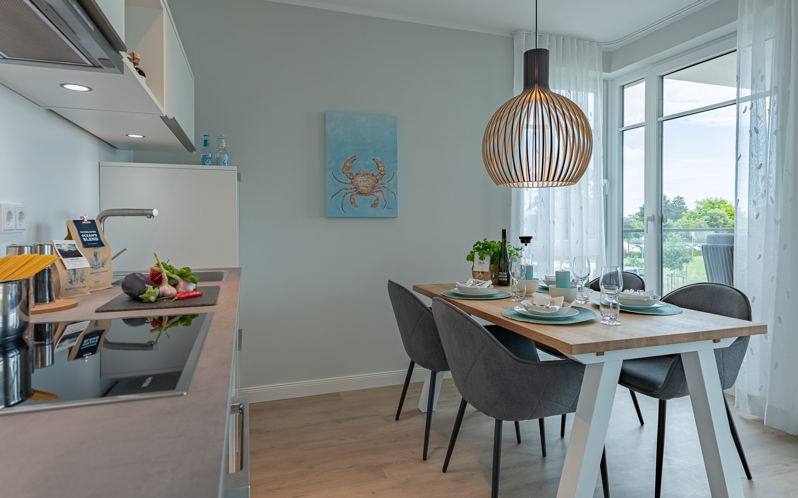 Die moderne, gut ausgestattete Küche, mit Miele Einbaugeräten und Nespresso-Maschine, ist offen gestaltet und perfekt in den Wohnraum integriert. Der angrenzende Essplatz ist für bis zu 5 Personen ausgerichtet.