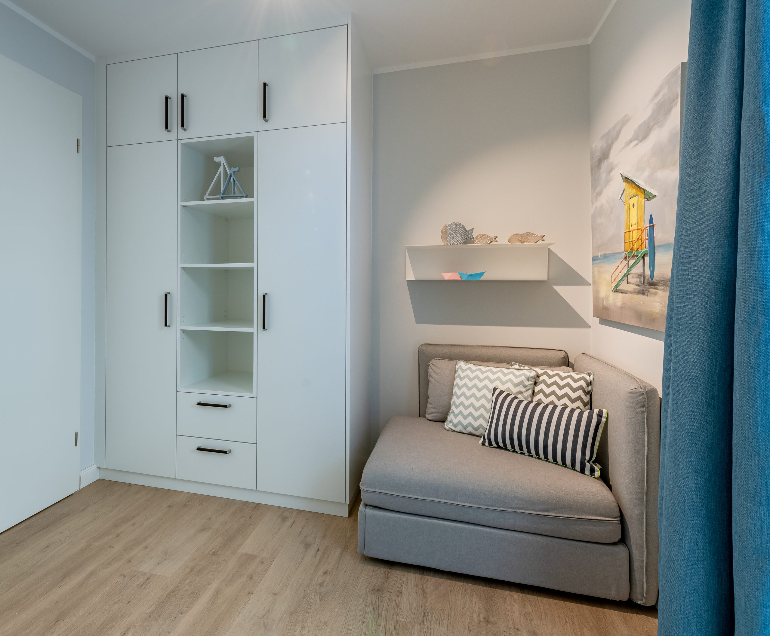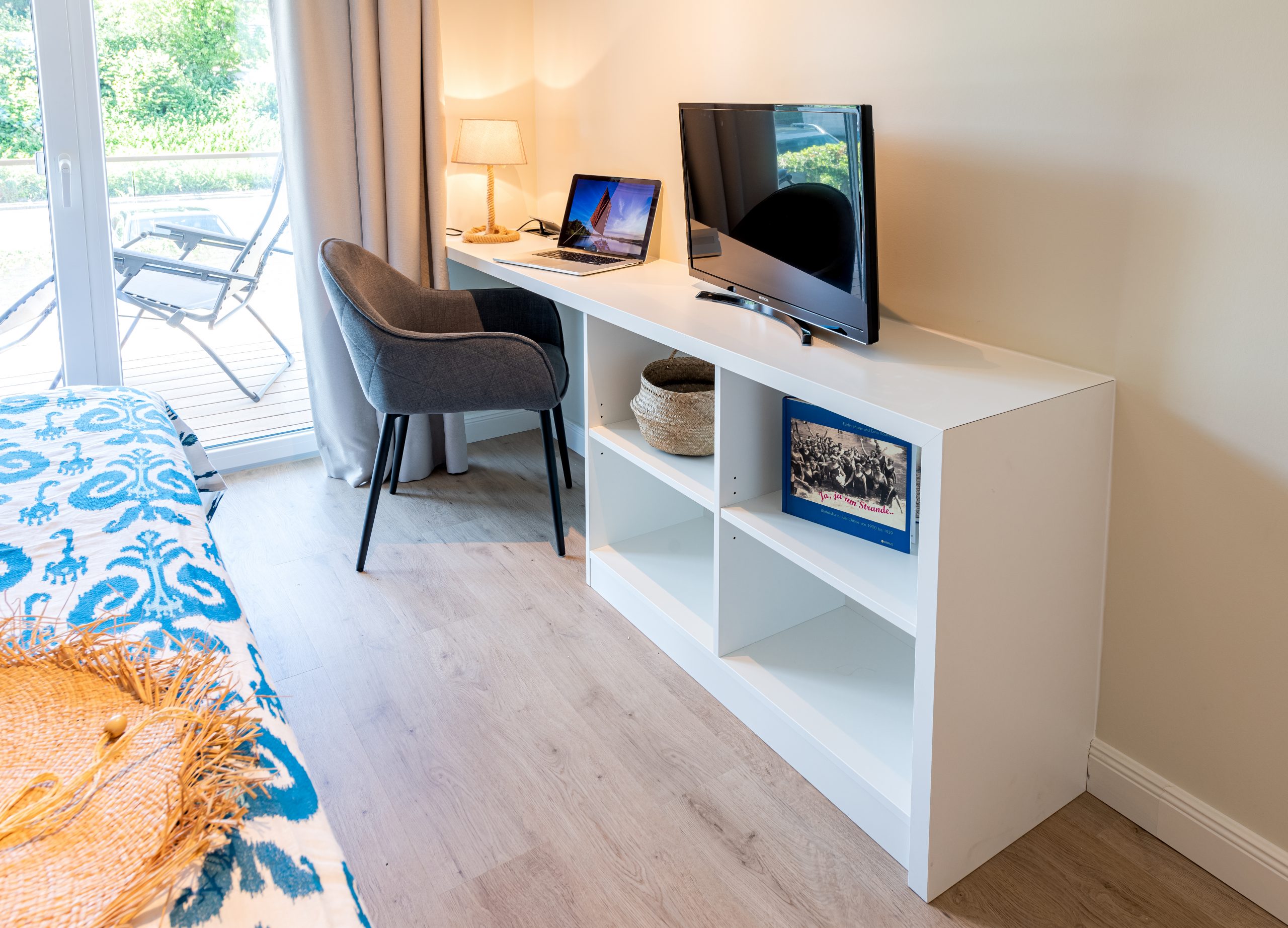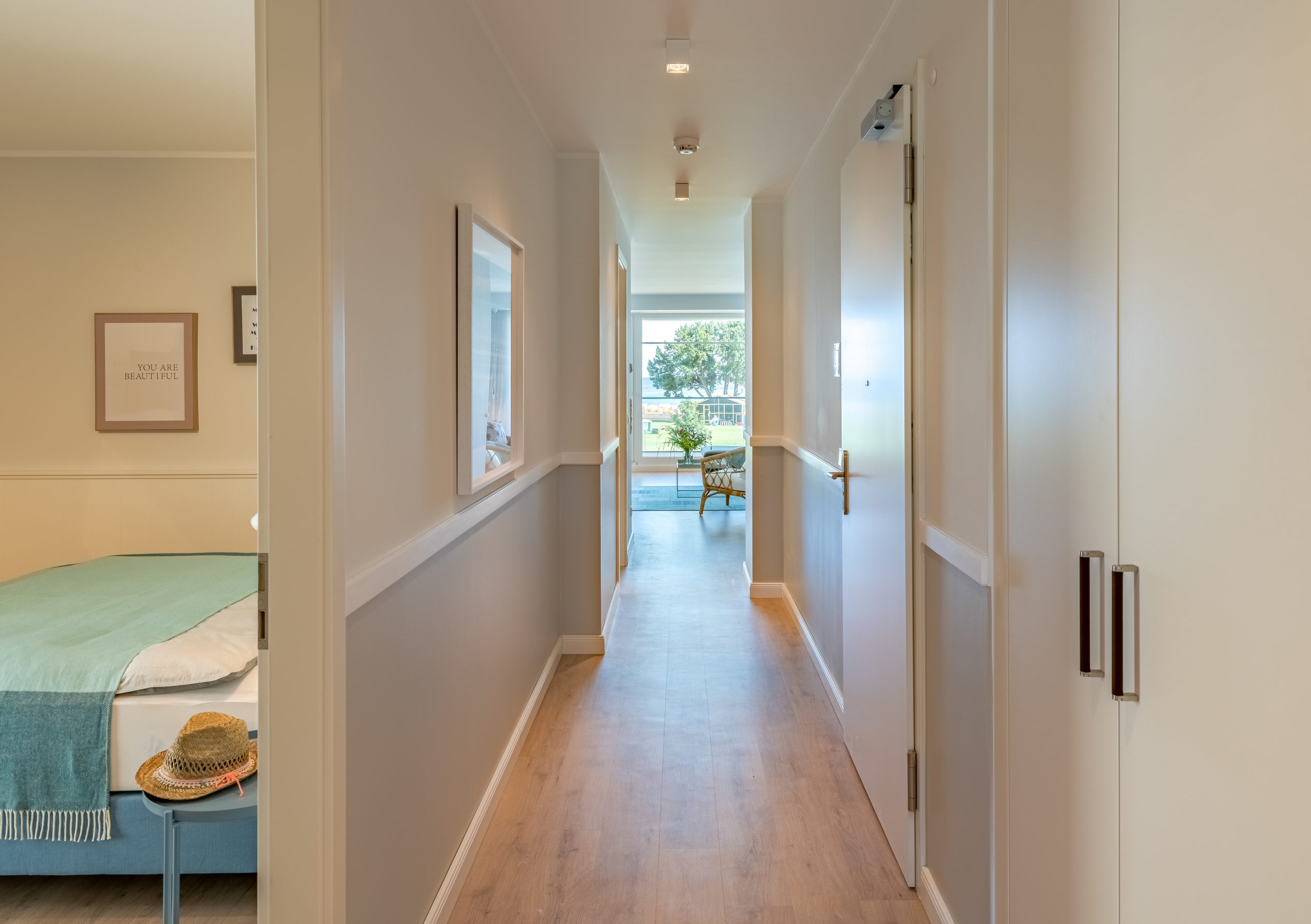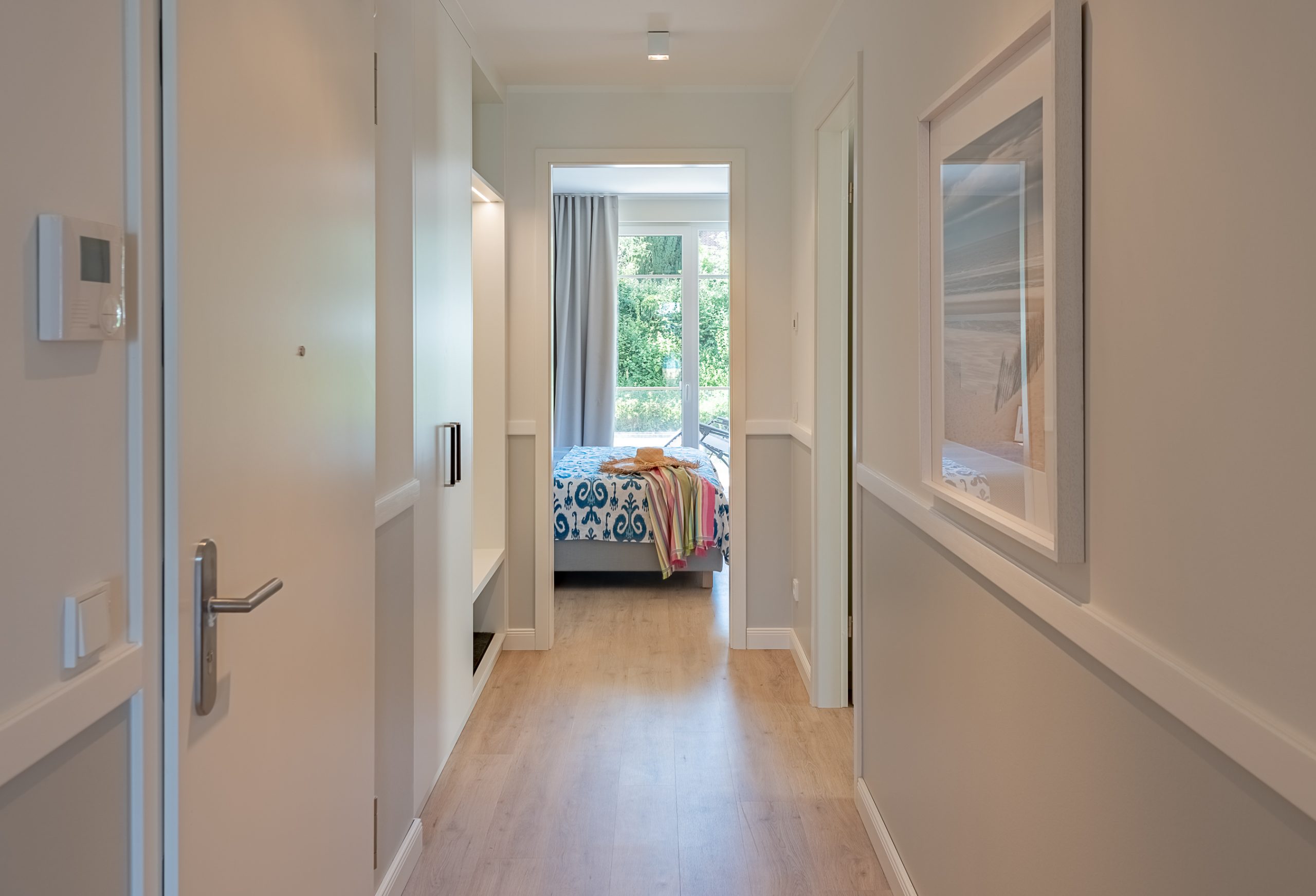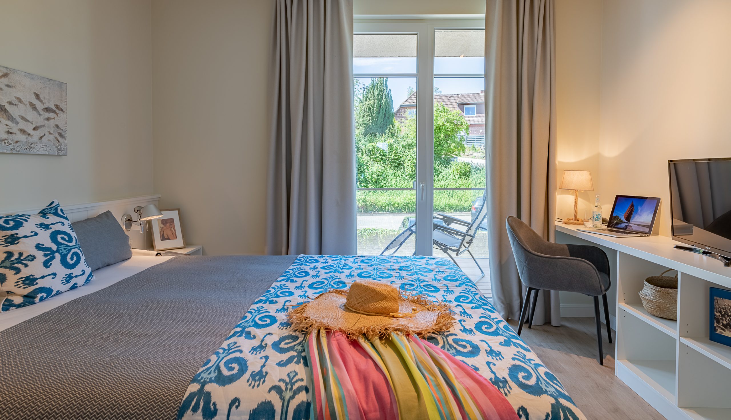 Entspannen Sie sorglos nach Ihrem Strandtag in einem der beiden separaten Schlafzimmer mit komfortablen Boxspring-Betten (Masterschlafzimmer: 220×200 cm, Kinderzimmer: 160×200 cm) und LED Smart TVs. Das Masterschlafzimmer hat einen zusätzlichen Balkon mit Lounge zur Entspannung sowie einen begehbaren Kleiderschrank. Hier befindet sich auch ein Schreibtisch mit LAN Anschluss.