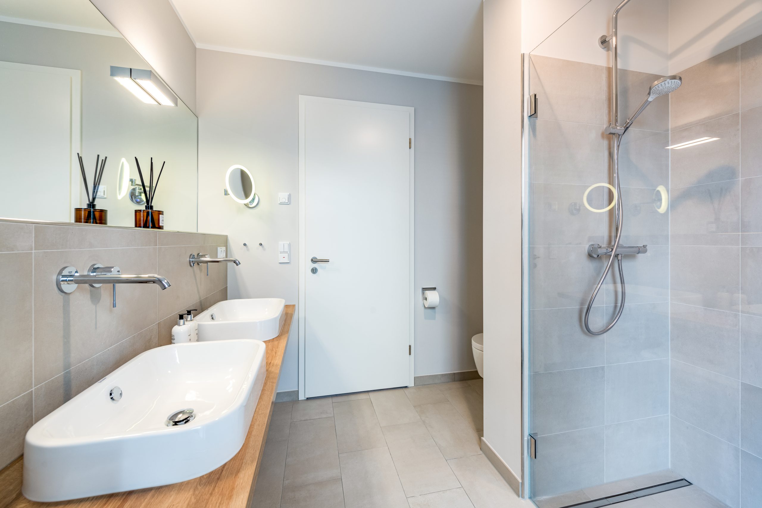 Im Nebenschlafzimmer befindet sich zusätzlich ein Schlafsessel für die fünfte Person. Das Bad begeistert mit Doppelwaschtisch, bodengleicher, großzügiger Regendusche, Handtuchheizung und beleuchtetem Schminkspiegel. Hier befindet sich auch ein Waschtrockner.